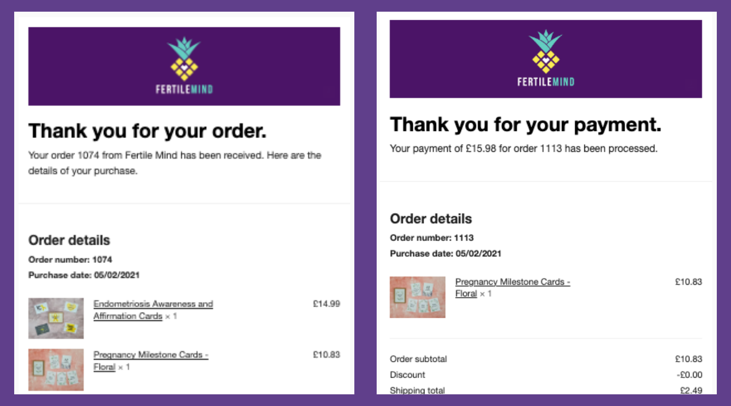 Purple Pineapple Digital developed a comprehensive automated email marketing strategy for Fertile Mind, focusing on five key triggered emails: order confirmation, shipping confirmation, order invoice, cancellation of order, and refund confirmation. Each email was designed to provide clear, concise information while reflecting the brand’s voice and values.